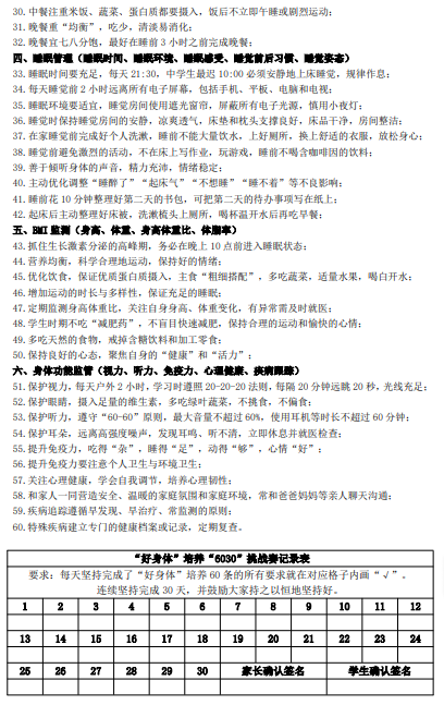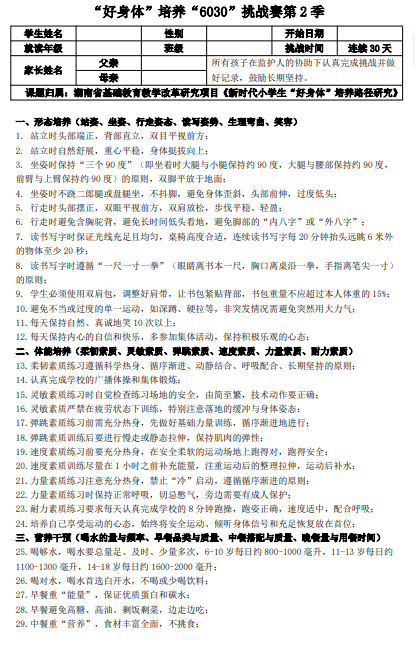 图1:好身体培养路径图 湖南湘江新区麓谷赫英小学书记、校长黄意斌带领的课题研究团队,深耕湖南省基础教育教学改革研究项目,以大数据分析为支撑,以全学科、全方位、全过程培养为路径,凝练出60 条贴合小学生日常的健康培养措施,通过 “连续坚持30 天”的挑战形式,让科学的健康理念融入生活,让良好的生活习惯落地生根。《好身体培养指南60条》(国作登字-2025-A-00340625)是该团队继独立自主研创《蕴育九好英才培育体系》和《四向课堂》后第3个取得国家版权局版权的教育科研成果。《好身体培养指南60条》也是该团队主持的湖南省教育厅第二届教育教学改革研究项目《新时代小学生“好身体”培养路径研究》研究成果之一。 2025年9月,第1季“6030 ”挑战赛的开展,让校园掀起了健康成长的新风潮。在家长的陪伴与监督下,同学们从规范站姿坐姿、坚持科学运动,到合理搭配饮食、养成规律作息,一步步将60 条健康准则转化为日常行动。校园里,“小眼镜”“小胖墩” 的身影少了,阳光开朗、活力满满的笑脸多了;课堂上,同学们的专注力更足了,精神状态更饱满了;生活中,大家学会了倾听身体的信号,养成了早睡早起、主动锻炼、合理饮食的好习惯,真正实现了从 “知道健康” 到 “做到健康” 的转变,也让 “好身体” 意识深深扎根在每一位同学心中。 继“好身体”培养“6030 ”挑战赛首次开展并取得显著成效后,2026年3月,正式启动“6030 ”挑战赛第2季,邀请孩子与家长们再度携手,以坚持为帆,以健康为桨,在科学锻炼中淬炼体魄、涵养身心!本次“6030 ” 挑战赛第2季,将延续首届的科学内核,以形态培养、体能培养、营养干预、睡眠管理、BMI 监测、身体功能监管六大维度60 条具体要求为核心,同时结合首届活动中孩子们的参与反馈,进一步优化打卡形式,让挑战更贴合校园生活与家庭实际。我们始终倡导 “家校携手”,希望家长们继续做好孩子的陪伴者与监督者,和孩子一起打卡、一起坚持,让健康成为家庭的共同追求,让亲子陪伴在健康挑战中更有温度。 少年强则国强,少年的健康体魄,是未来的坚实根基。60 条准则,是科学的健康指引;30 天坚持,是习惯的养成起点。本次挑战赛不仅是一次身体素质的锤炼,更是一次意志品质的磨砺 —— 当坚持成为习惯,当健康融入日常,同学们收获的不仅是强健的体魄,更是受益终身的生活方式。 新的挑战,新的征程!愿全体同学以此次挑战赛为契机,带着首届的收获与成长,以更饱满的热情、更坚定的毅力,积极参与、认真坚持,在日复一日的行动中,让身体更健康、心态更阳光、成长更有力。让我们再次携手,以体赋能,以健立身,在科学培养中遇见更好的自己,让健康之花绽放在校园的每一个角落!